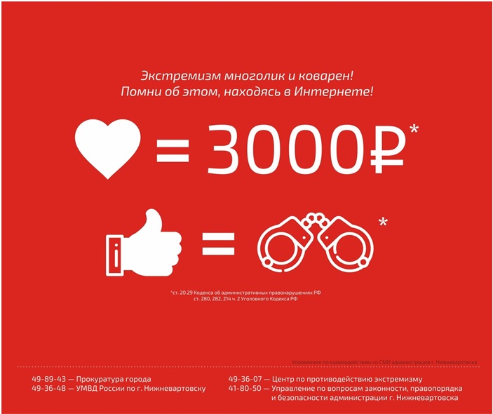 Прокуратура города Нижневартовска напоминает об ответственности за экстремизм. В соответствии со ст.29 Конституции Российской Федерации запрещены: пропаганда или агитация, возбуждающие социальную, расовую, национальную или религиозную ненависть и вражду, а также пропаганда социального, расового, национального, религиозного или языкового превосходства.
